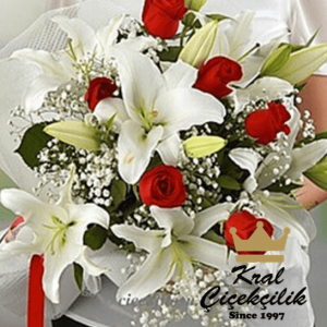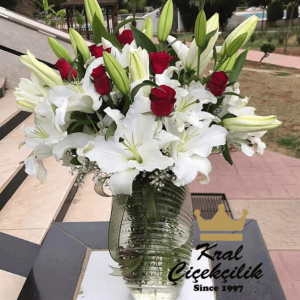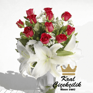 ₺ 129,00 + KDV Sepete EkleVazo İçinde 11 Adet Kırmızı güller ve Lilyum Goncaları