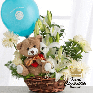 Yeni dogan sepet içinde lilyum jerbera ve ayıcık
