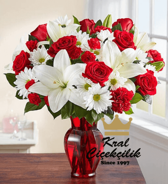 Kırmızı Vazo da Lilyum ve Kırmızı Güller