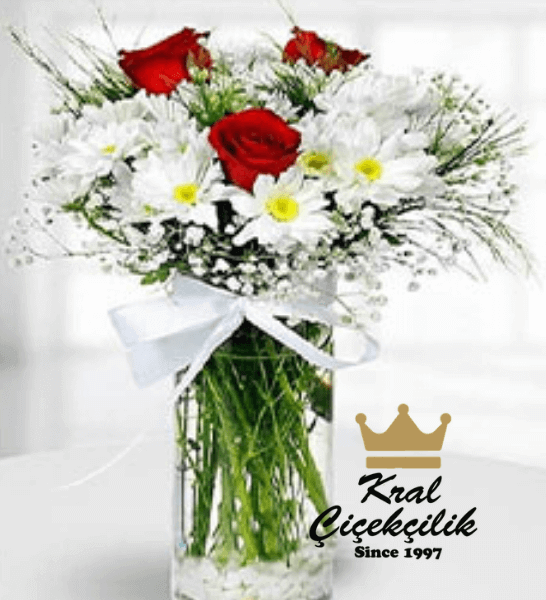 Kırmızı Vazo da Lilyum ve Kırmızı Güller