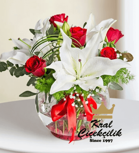 Masa Çiçeği Fanusda Gül ve Lilyum Çiçekleri