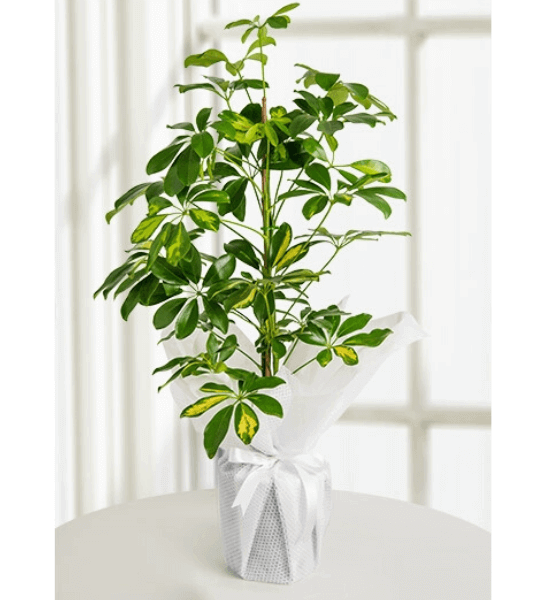 iki farklı rengi yapraklarında barındıran zarif ve 60 cm yüksekliği ile görkemli şeflera bitkisi.