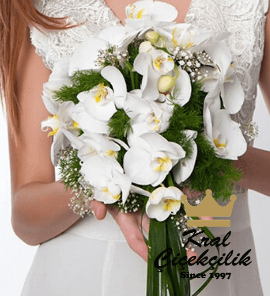 Orkide taneleri beyaz gül goncaları ve kurdele tasarımı ile dikkatinizi çekebilir.