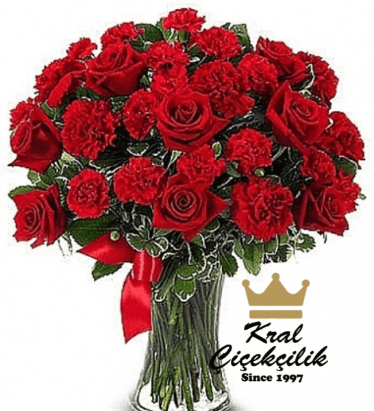 cam vazo içerisinde kırmızı gül ve karanfillerden oluşan şık tasarım